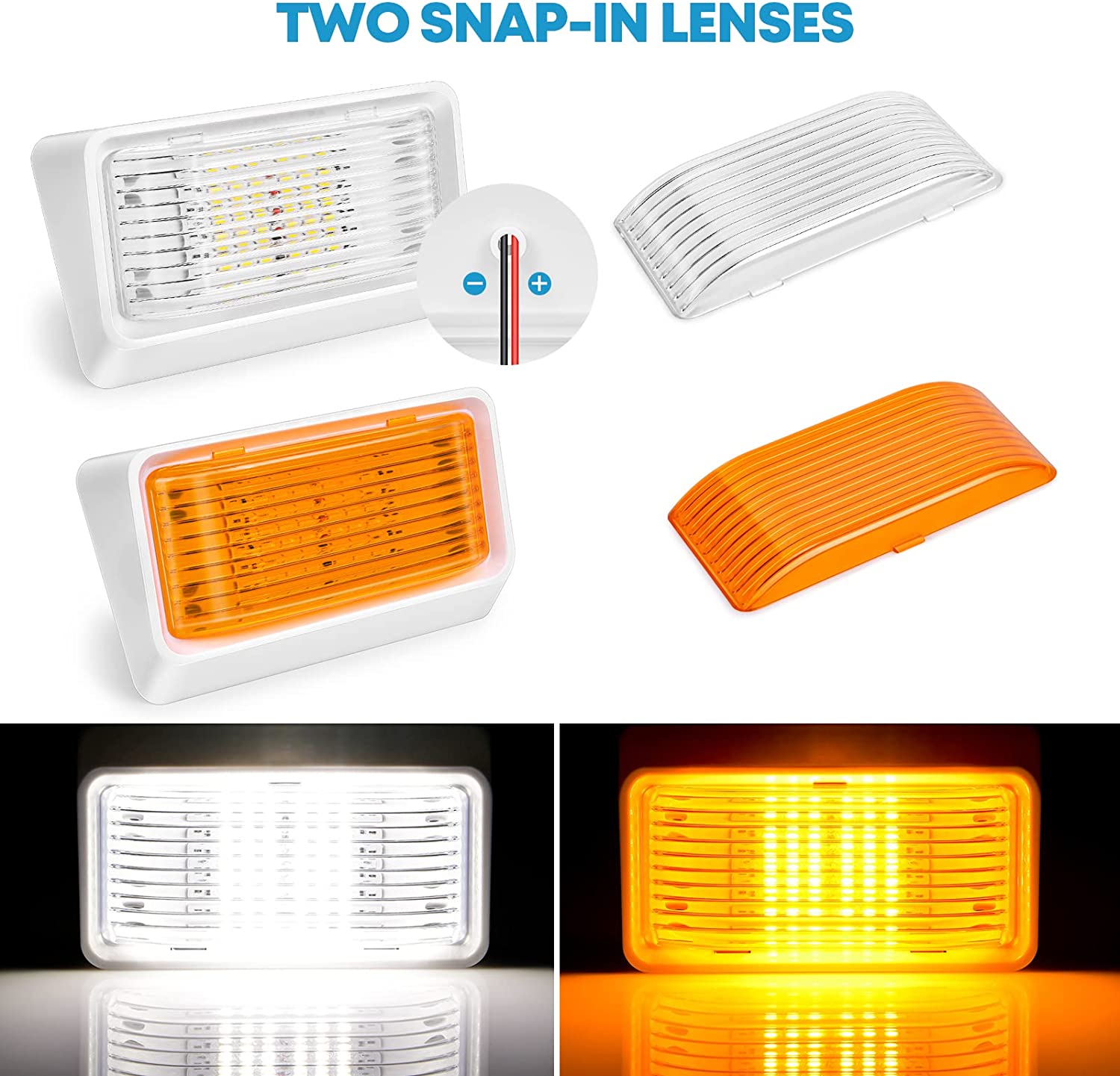 The Kohree RV Porch Light comes with two snap-in replaceable lenses, clear and amber, and boasts a total of 24 high-power 5050 LEDs, providing an output of 320 Lumens. With durable lenses and a compact size of 6" x 3.6" x 1.8" (15.4cm x 9.2cm x 4.6cm), this RV Porch Light is the perfect lighting solution for any recreational vehicle.