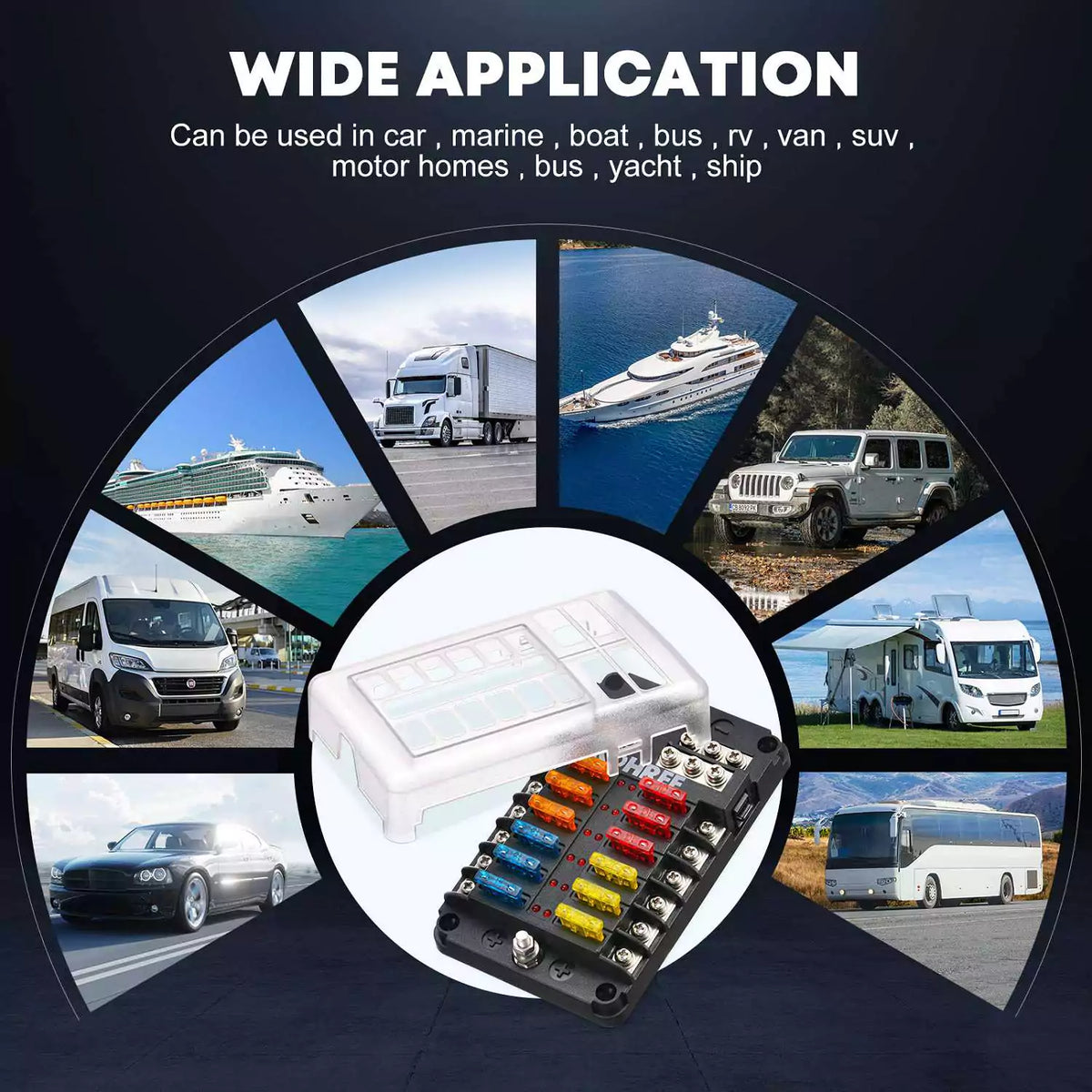 • Wide Applications: The fuse block comes with multi-function DIY stickers to meet all your specific demands, making it convenient for examination and repair. It is widely used in cars, marines, tankers, boats, RVs, trucks, motor homes, SUVs, yachts, and ships, ensuring versatility and reliability.
