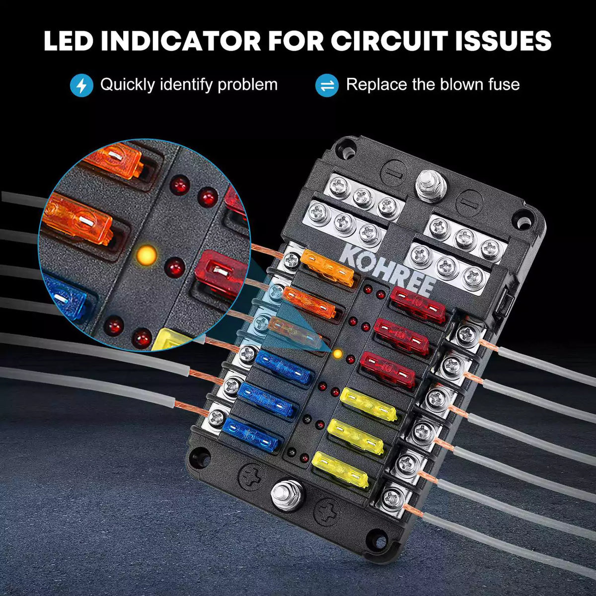 • Safe LED Indicator Design: Our 12V fuse boxes come with 30 fuses (5A, 7.5A, 10A, 15A, 20A, 25A), and each circuit has its own LED indicator light. When a fuse blows, the corresponding indicator lights up instantly, making it easy to identify and fix any short circuits or faults.
