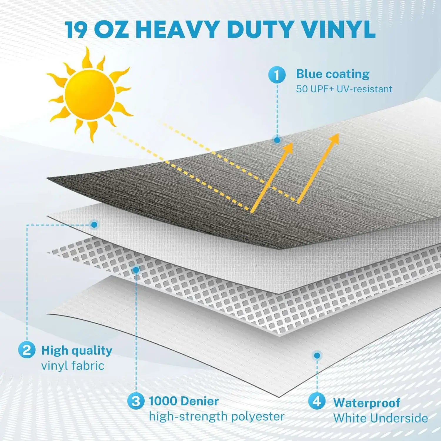The fabric features a heavy-duty 4-layer design, including a black coating with 50UDF (Ultraviolet Defense Factor) and UV resistance, high-quality vinyl, 1000D high-strength polyester, and a waterproof white underside.