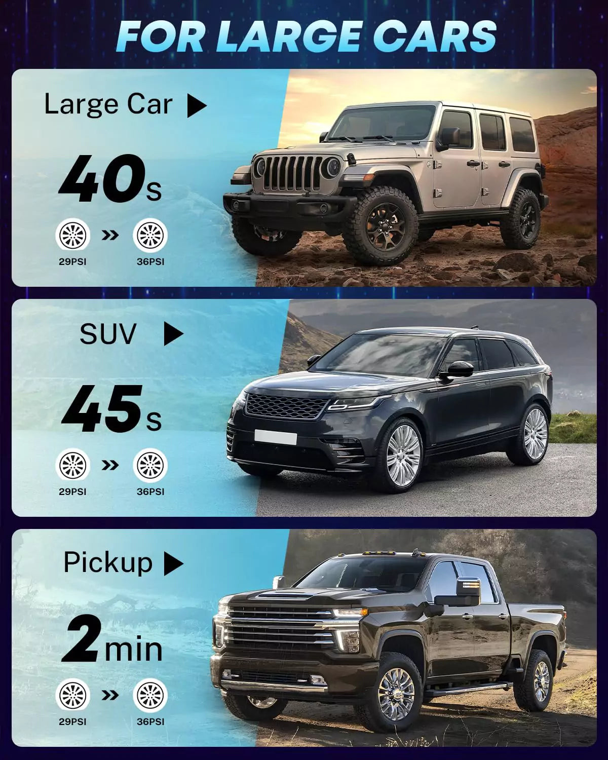 • 5X Faster Inflation for Quick Emergencies: Engineered with an upgraded dual-cylinder system and a powerful motor, this portable air compressor delivers an impressive 58LPM airflow. It inflates a 255/55/R20 tire from 29 PSI to 36 PSI in just 40 seconds—getting you back on the road faster and safer during unexpected roadside situations.
