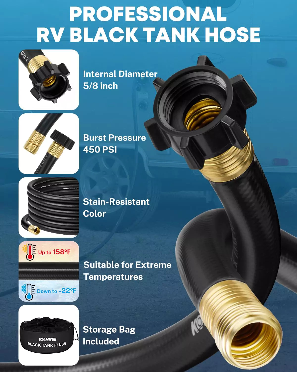 • Durable 25-Foot Hose with Universal Compatibility: The included 25 ft RV black water hose with a 5/8-inch internal diameter connects easily to standard water faucets. Compatible with both gray and black tank cleaning systems, it’s a must-have RV accessory for motorhomes, campers, and travel trailers.