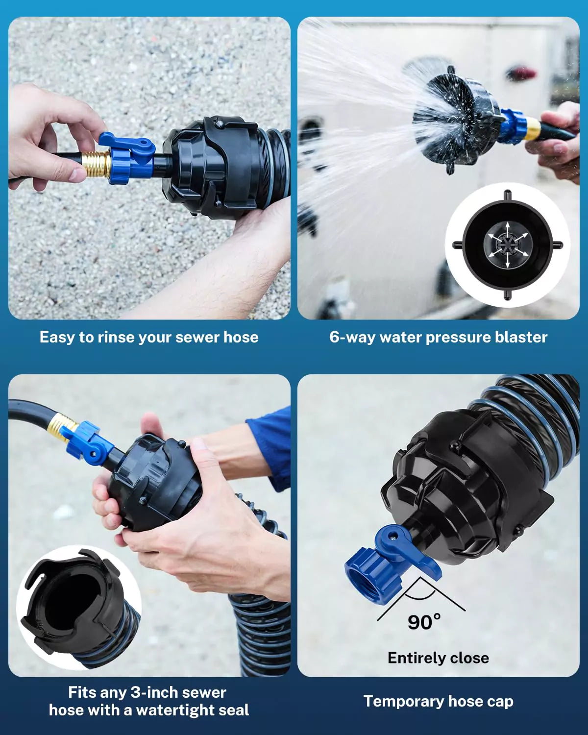 • 4-Way High-Pressure Cleaning Power: The rinser cap features a multi-directional 4-way water blaster that delivers powerful pressure for maximum coverage. It clears out stubborn debris and residue, leaving your RV sewer hose thoroughly cleaned and ready for storage.