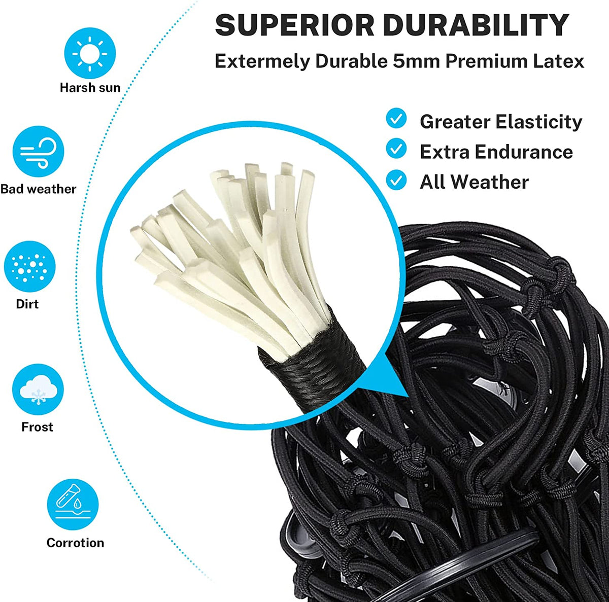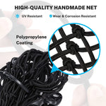 Kohree Truck Bed Cargo Net is made of thick 5mm latex core bungee webbing and durable polypropylene coating, providing excellent durability and wear resistance even in tough weather conditions. Its stretchable 3'x4' size can expand to 6'x8', thanks to the tight 3”x 3” mesh squares that keep small items from falling out while protecting larger cargo items during the ride.