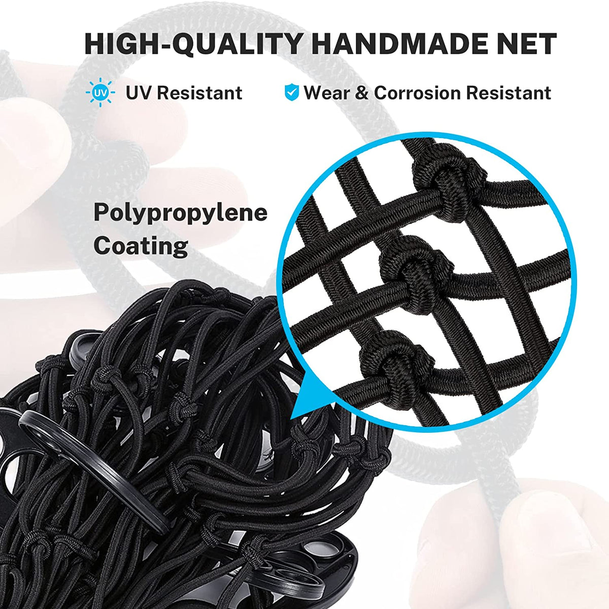This cargo net is ideal for rooftop cargo carriers, rooftop baskets, and luggage racks of large pickups, trucks, small trailers, jeep wranglers, SUVs, and more. It provides reliable and secure storage for camping, ATV/UTV, oversized jeep, boating, and road trips.